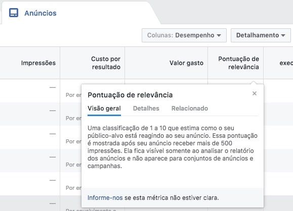 De acordo com o Facebook, a pontuação de relevância é uma classificação de 1 a 10 que estima como o seu público-alvo está reagindo ao seu anúncio.