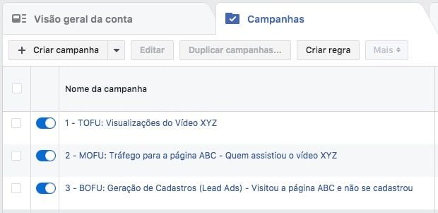 Veja na imagem abaixo um exemplo de 3 campanhas criadas no Gerenciador de Anúncios para estruturar o Funil de Conversão:
